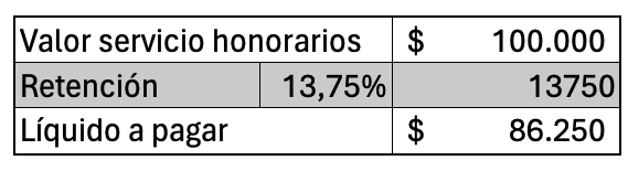 Para determinar el valor de la boleta de honorarios, simplemente dividimos el monto líquido de pago entre el factor 0.8625. Este factor se calcula restando 100 menos el porcentaje de retención aplicado, que en este caso es del 13,75, y luego dividiendo el resultado por 100)